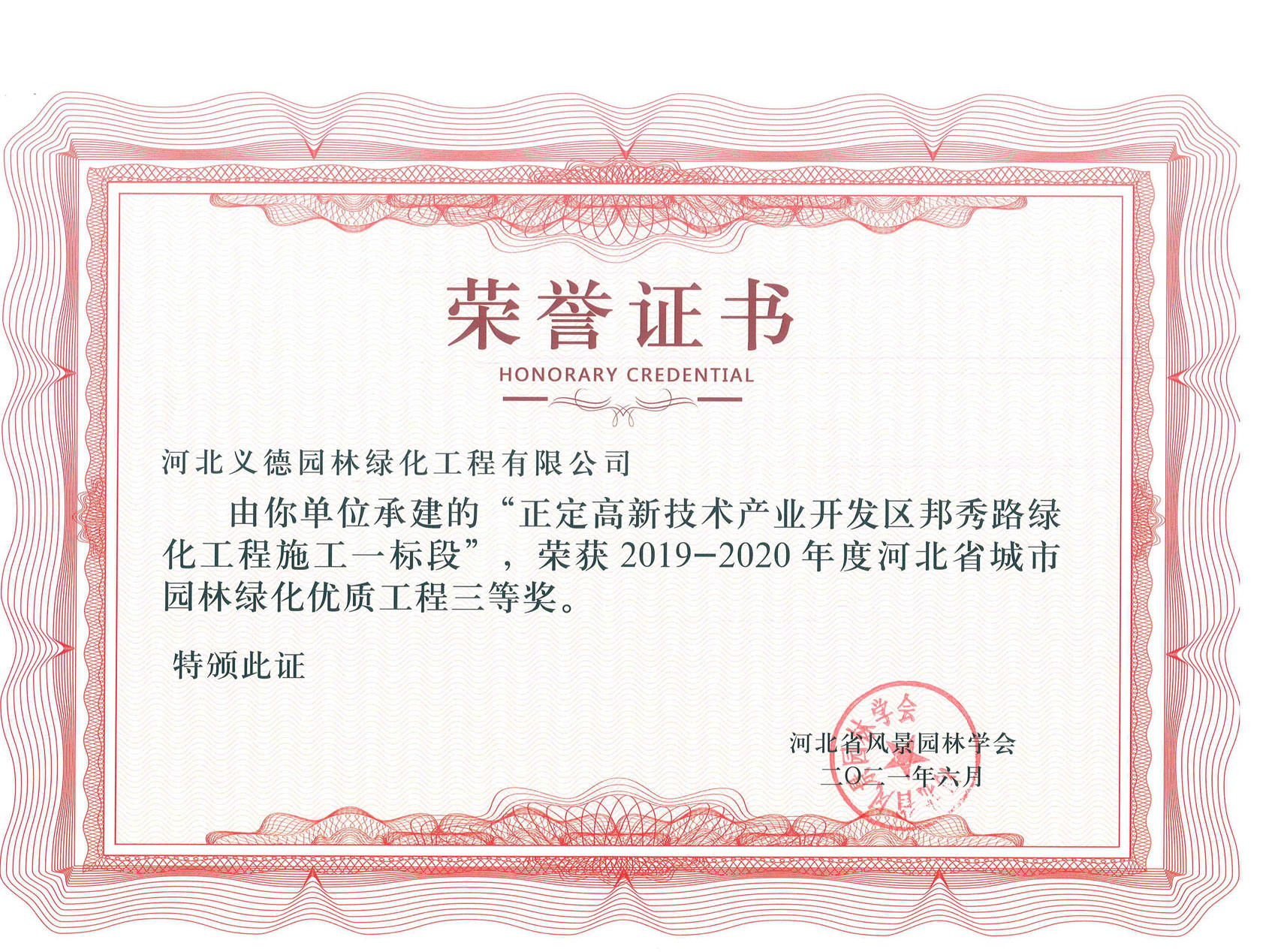 近幾年來我公司被授予2019年-2022年河北省扶貧龍頭企業、2018年國家林業標準化示范企業、2019年度全國苗圃50強、2018-2019年度河北省林業重點龍頭企業、2018年保定市精品特色現代農業園區、2018年度保定林木種苗協會授予特色苗圃、2018年度北方十佳特色苗圃、2016-2019年河北省建設工程招標投標誠實守信5A級施工企業等榮譽稱號,2017年保定市林木種苗龍頭企業、石家莊市2017年度優秀園林企業。